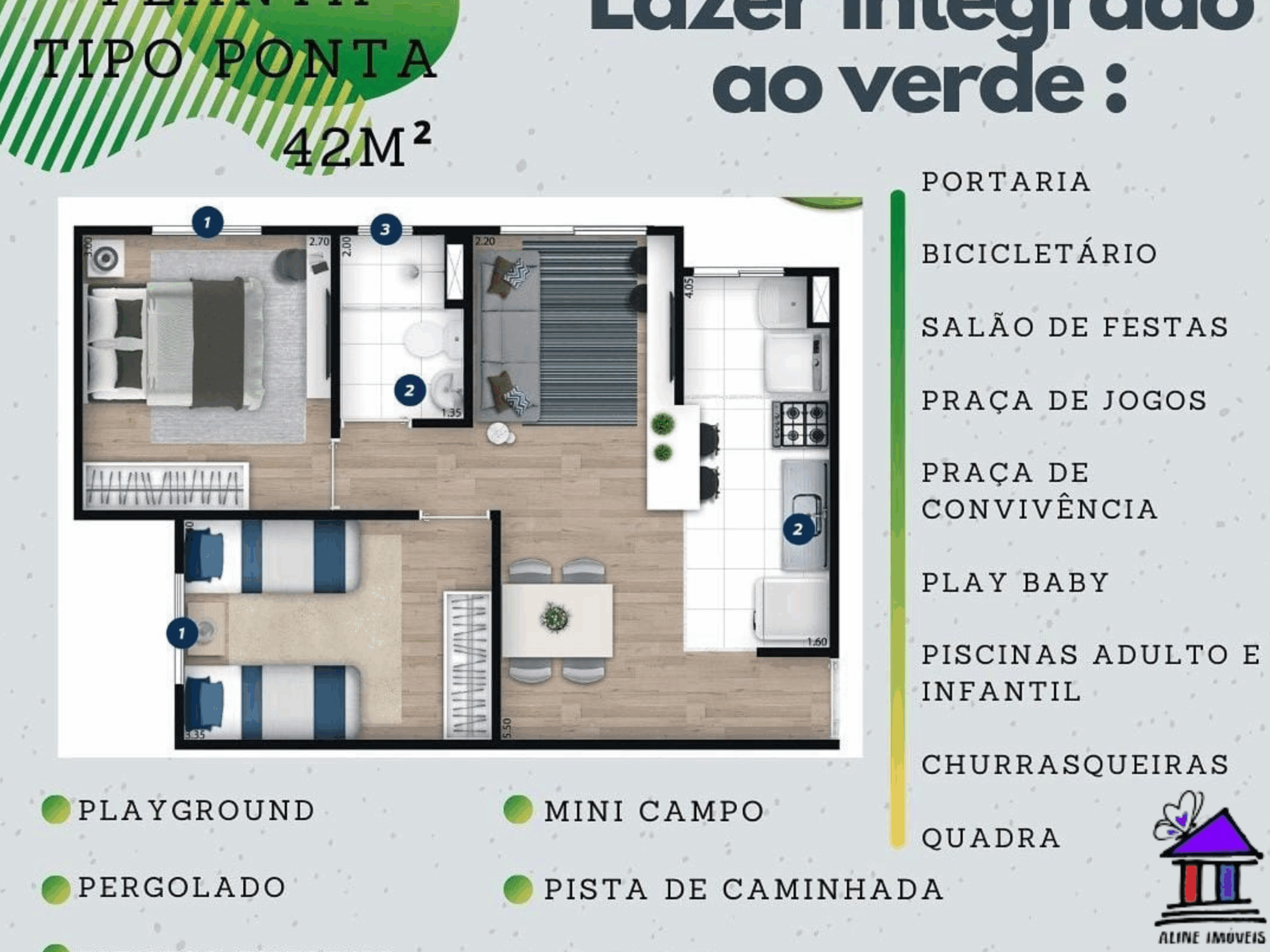 APARTAMENTO COM 42M² 3° ANDAR | 2 DORMITÓRIOS, SALA DE ESTAR, COZINHA, 01 BANHEIRO, 1 VAGA | CONDOMÍNIO CONTA COM PORTARIA, BICICLETÁRIO, SALÃO DE FESTA, PRAÇA DE JOGOS, PLAY BABY, PISCINA ADULTO E INFANTIL, QUADRA POLIESPORTIVA, MINI CAMPO, PET PLACE, PLAYGROUND E ÁREA DE PIQUENIQUE